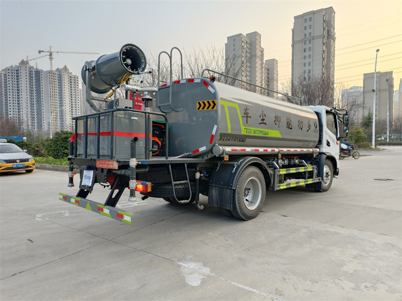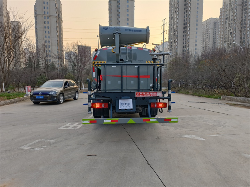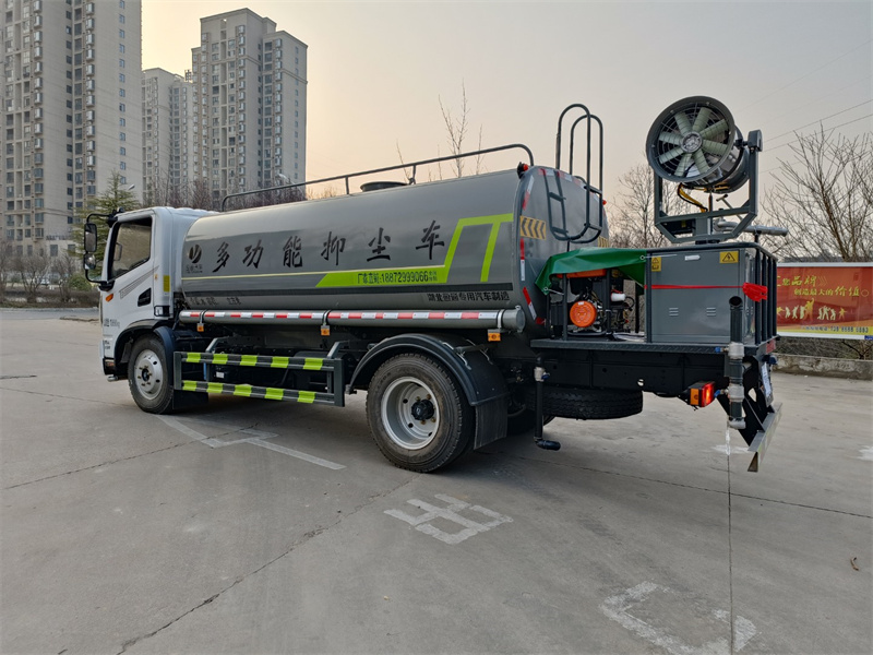 東風新款8-10噸霧炮灑水車標配前噴(鴨嘴)、后沖、后灑、側噴、后置式工作 平臺,平臺上配置綠化水炮(可 360°旋轉,既可以調成柱狀,也可 以調成霧狀,更可以調成直沖狀、大雨、中雨、小雨、毛毛雨),配 備優質大功率專用灑水泵(可自吸自排,可從河里或池塘抽水到罐體), 取力器,雜物過濾網,消防接口,自流球閥系統、取力器、球閥、濾網 均為國家標準產品,主管道加粗,法蘭墊、法蘭盤加厚,大通徑球閥。 整體具備性能優良安全可靠、效率高、流量大、維修方便等特點